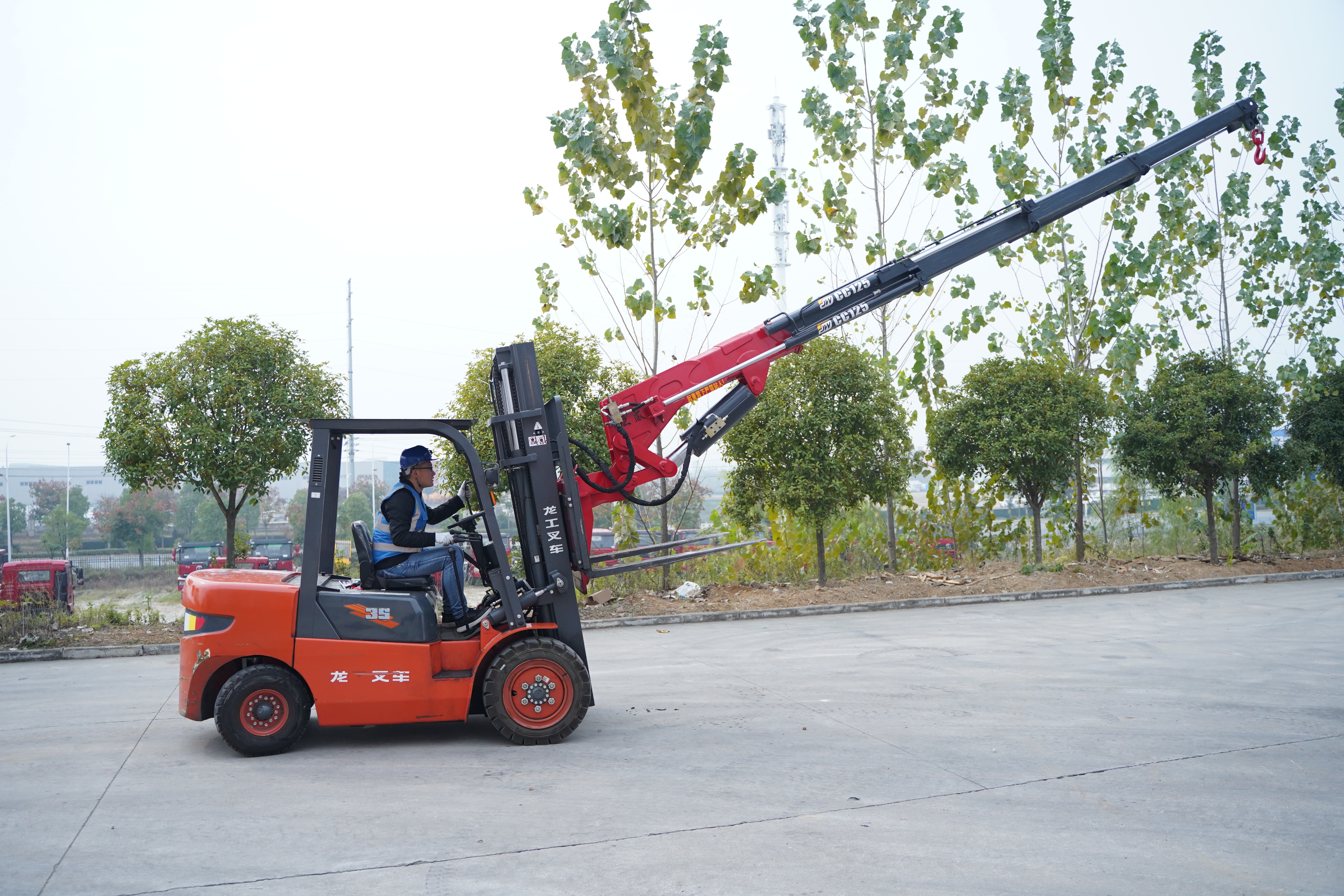 江威6噸飛臂吊(CC125),4節(jié)液壓一節(jié)手拉臂帶彎頭副臂,最大工作半徑8.2米,不出臂吊4.5噸,全部升出吊300多公斤,建議配在5噸或5噸以上的叉車上,如果只需要高度也可以配3.5噸叉車,加叉車門架高度3米最大起升高度11.7米。