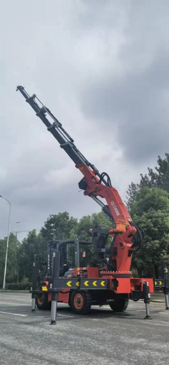 可裝在5噸或5噸以上的叉車上,5節(jié)液壓一節(jié)手拉,帶彎頭副臂,最大工作半徑14.6米。相比前飛臂吊優(yōu)勢:可360度旋轉(zhuǎn),帶5條支腿,4米吊10噸,全部升出吊1.2噸。
