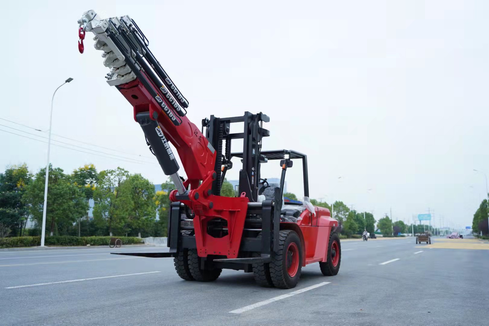 叉車飛臂吊就是利用叉車作為基礎(chǔ),在叉車前端加上一個(gè)專用吊臂,改成的吊車,隨車吊。從而進(jìn)行吊裝作業(yè)的一個(gè)工具,也算是叉車的一個(gè)屬具。